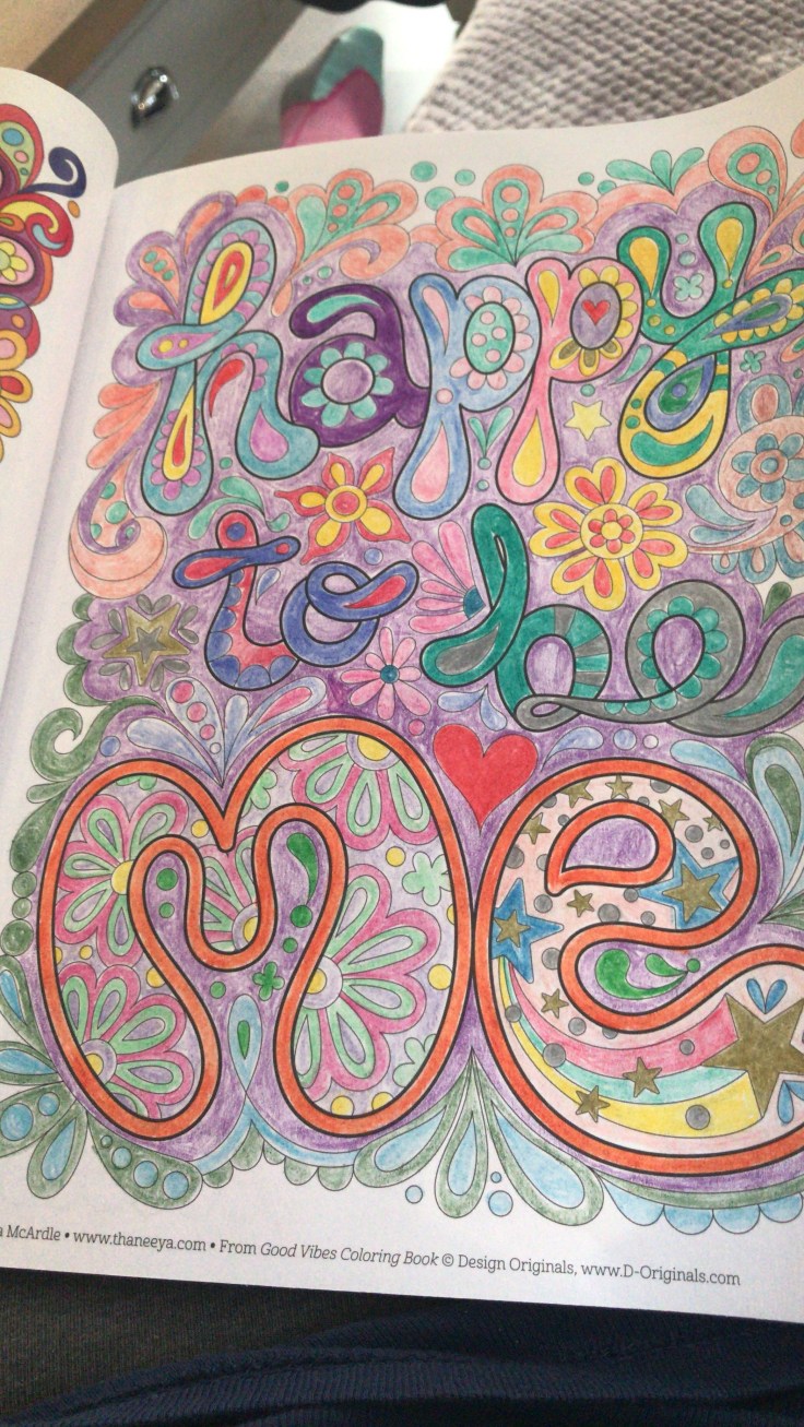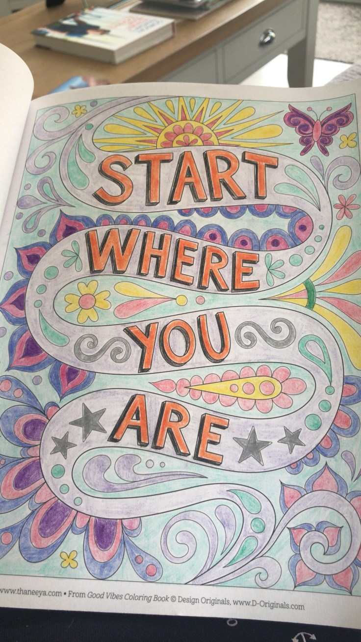 I spend a lot of today colouring in, I am trying to be in the here and now. It helps, stops me from googling anyway. I colour in one page that’s says “start where you are”. Is this a message from Findley? Start where I am. I have no idea where I am.